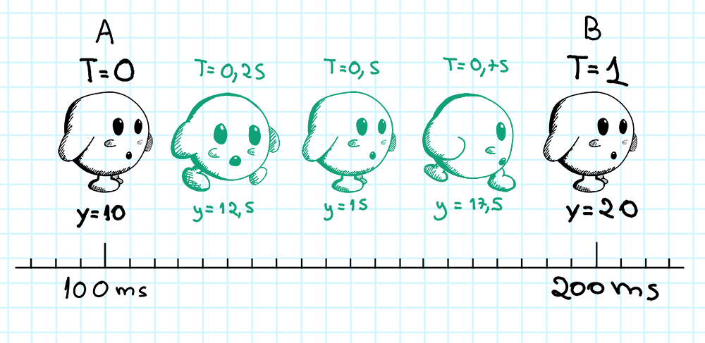 Num primeiro momento, T será igual a 0. O jogo desenha na tela a atualização do servidor da mesma maneira como ela chegou. No próximo quadro, a fórmula nos dá um valor um pouco maior, digamos 0,25, colocando o personagem um pouco mais próximo de B. No próximo quadro, 0,5, e assim por diante, até finalmente chegarmos em B. Quando chegamos em B, a informação contida em A é descartada. B torna-se o novo A e o ciclo se repete.