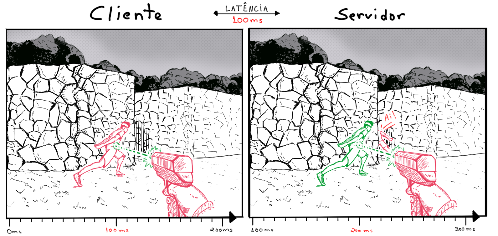 Para entender como os disparos são efetuados num jogo de tiro multijogador e porque esse fenômeno ocorre, precisamos entender o conceito de latência.